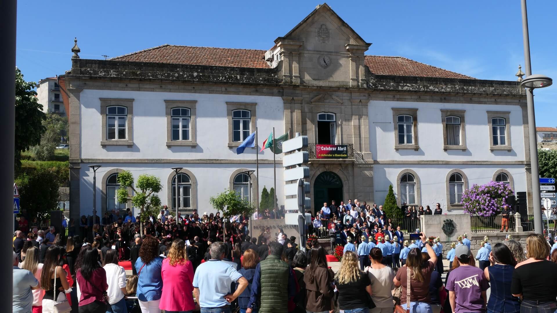 As comemorações tiveram início junto aos Paços do Concelho, com uma cerimónia solene que integrou uma guarda de honra composta por uma Força a Cavalo da GNR e pela formatura dos Bombeiros Voluntários de Cinfães e de Nespereira. O momento foi acompanhado pela interpretação da marcha “25 de Abril”, pela Orquestra de Sopros e Coro da Academia de Artes de Cinfães, criando um ambiente de respeito e evocação histórica.